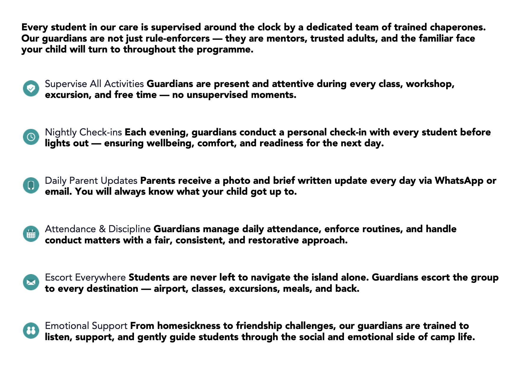 Our guardians are not just rule-enforcers — they are mentors, trusted adults, and the familiar face your child will turn to throughout the programme.